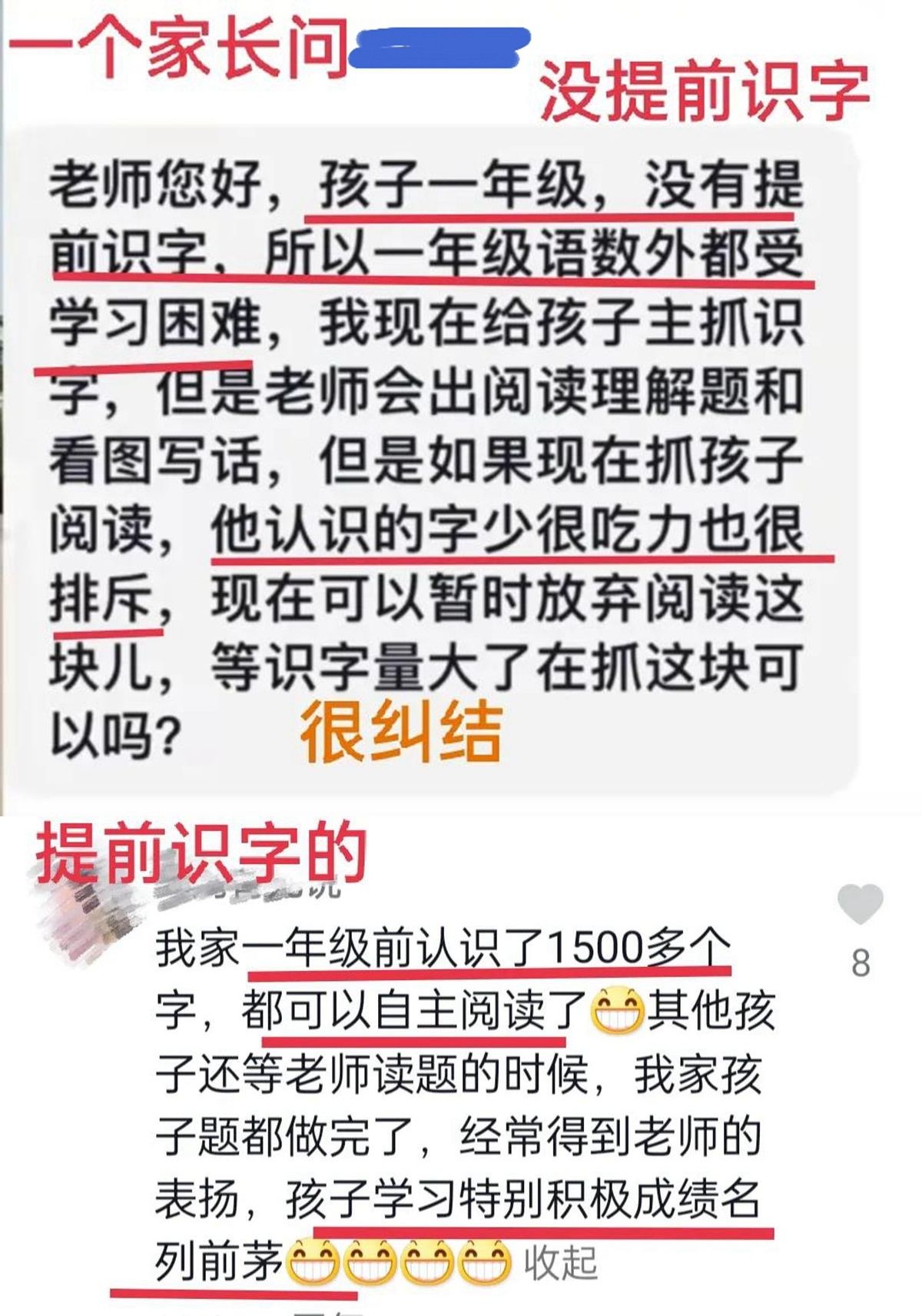 “孩子学习识字,并不是‘超前学习’,你可能有所误解了。识字反倒是上小学之前的一个重要因素,孩子如果在上小学前一个字也不认识,那耽误的可能不仅仅是小学的成绩,甚至会影响到孩子的一生。”