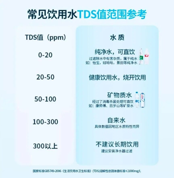 TDS<100mg/L:水质挺好的,选超滤机就够了,还能保留矿物质,也不用排废水。
